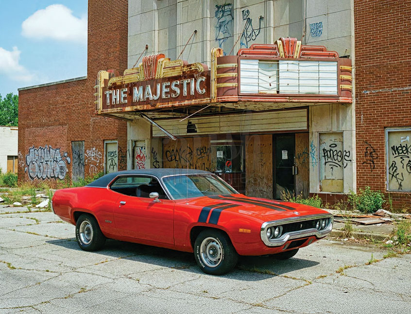 A red muscle car sits parked in front of an abandoned movie theater called The Majestic.