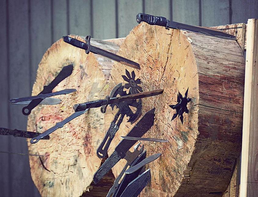 Machetes, Knives, Shurikens, Tomahawks and Daggers in a Target Crafted from Tree Trunks Martial Arts Training Photo