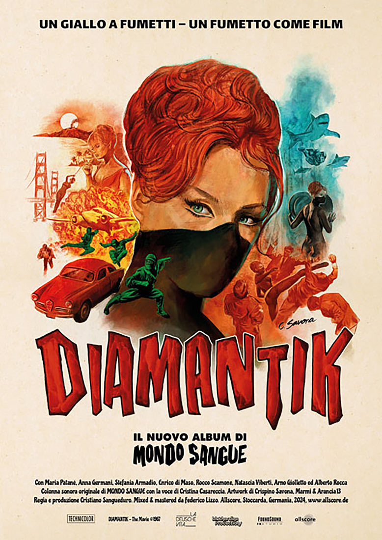 With Diamantik, Mondo Sangue takes the audience to the dazzling and stylish world of the swinging sixties. The psychedelic pop-art adventure also delivers some border crossings: Eurospy, adventure and martial arts cinema meet beat, bossanova and disco. Diamantik’s daring escapades are told by means of edgy electric guitars, groovy drum beats, glamorous orchestral movements and epic vocal lines. The result is a timeless genre cocktail, served up as a brightly colored concept album.